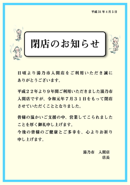 ホームページに閉館のお知らせ。 お知らせ 平成26年3月30日に閉館致します。 皆様の長年にわたる ご愛顧に心から感謝申し上げます。