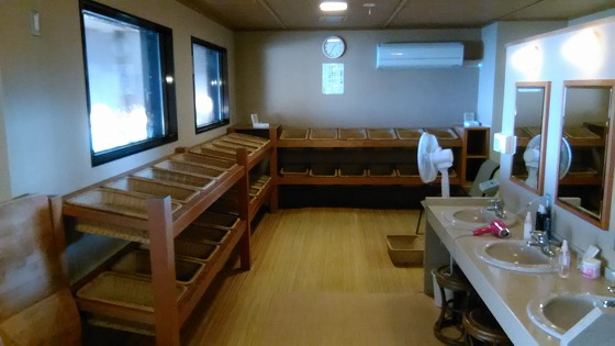露天風呂は岩風呂と檜風呂の2つ、薄黄緑の温泉が注がれている。 温泉は加温されて41.5度位に調整されていて熱め。 壺湯は純米酒風呂となっていて、お酒は定期的に追加投入される。 施設内は所狭しと、土産物やゲーム機・ガチャポンが置かれており、ゆったり感はなく湯上がりに落ち着けない。 もう少しゆったりとした無駄な空間があれば、湯上がりに落ち着けるのだが。
