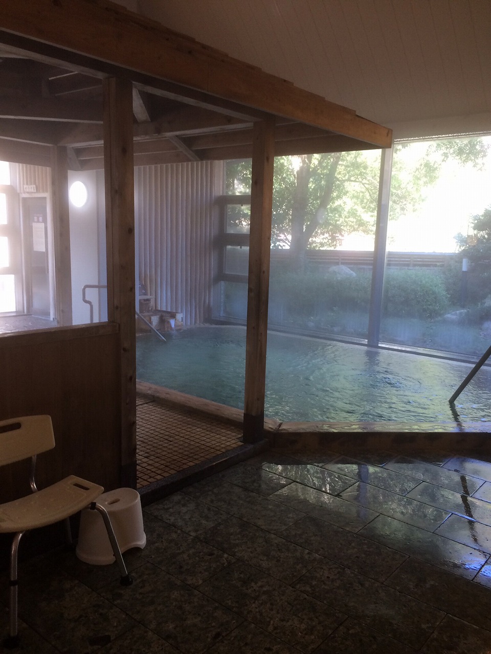 浴室は2階にあります。眺望を期待していたのですが、目隠しのために窓にはミラーフィルムが貼られており、紫がかった窓越しの風景で開放感はありません。 露天風呂へは階段を降りて向かいます。 露天風呂も2m程の高さの目隠しの為に開放感は全くありません。 泉質は強塩泉で、熱めに設定されていたので、良く温まりました。 地元のお年寄りの方が、多く訪れておりましたが、施設には階段が多く、新しい施設にしてはバリアフリーとは対局の施設となっていました。 洗い場も奥まった所に設置されており、熱気がこもっておりました。 カランの位置が異常に高く、足を洗おうと頭を下げると、カランに頭をぶつけてしまいました。 鏡下の石鹸おきスペースが狭く石鹸箱すら乗らない等、施設自体はなんとも使いでの悪いものですが、温泉自体はよいものでした。 少し離れた場所にある、足湯は浸かりながら海が眺められるとの事でしたが、この日は窓が曇ってしまっていて眺められませんでした。