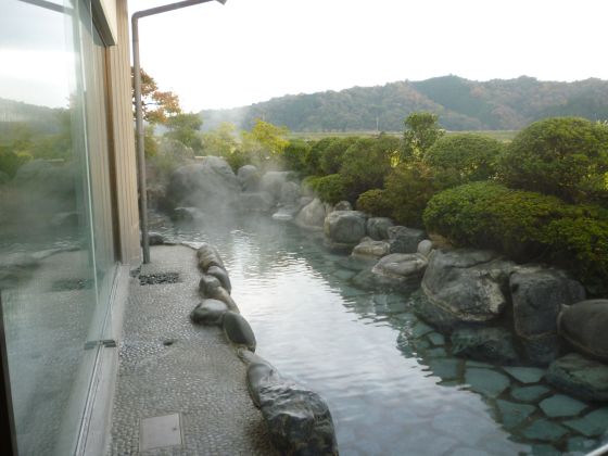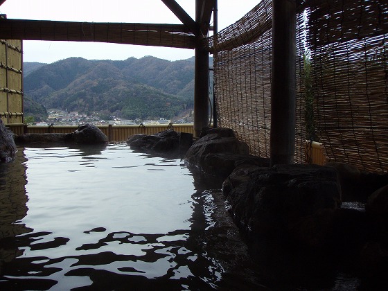 先日、当施設に立ち寄り、茶の湯エリアの温泉施設を利用しました。 1月下旬とあってか広めの露天風呂は寒く、多少がまんして展望風呂まで階段を登りましたら、向かいに佇む伊賀山系のなだらかな山並みが目に飛び込んできました。42〜43℃の美湯に浸りながら、遠く向こうに林立する白い風車や足元に広がる緑の茶畑に癒され、至福のひとときを味わえました。